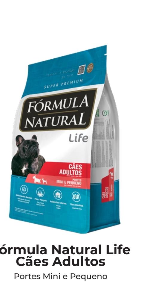 Com um conceito natural do produto às embalagens, a Fórmula Natural foi formulada para promover uma vida mais saudável, longeva e de bem-estar para cães e gatos. A linha oferece versões para diferentes portes e idades e proporciona entre outros benefícios, cuidados com a pele e pelagem, equilíbrio da flora intestinal e antioxidantes naturais. Fórmula Natural Super Premium Cães Adultos Portes Mini e Pequeno oferece todos os cuidados para cães adultos de porte miniatura e pequeno, a partir de um ano de idade.