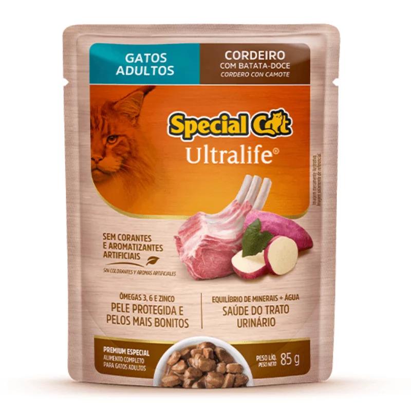 O Sachê Special Cat Ultralife Cordeiro é uma opção de alimento úmido desenvolvida por veterinários, priorizando a saúde e o bem-estar dos gatos adultos. Sua fórmula cuidadosamente elaborada exclui corantes e aromatizantes artificiais, proporcionando uma experiência alimentar natural e saudável.