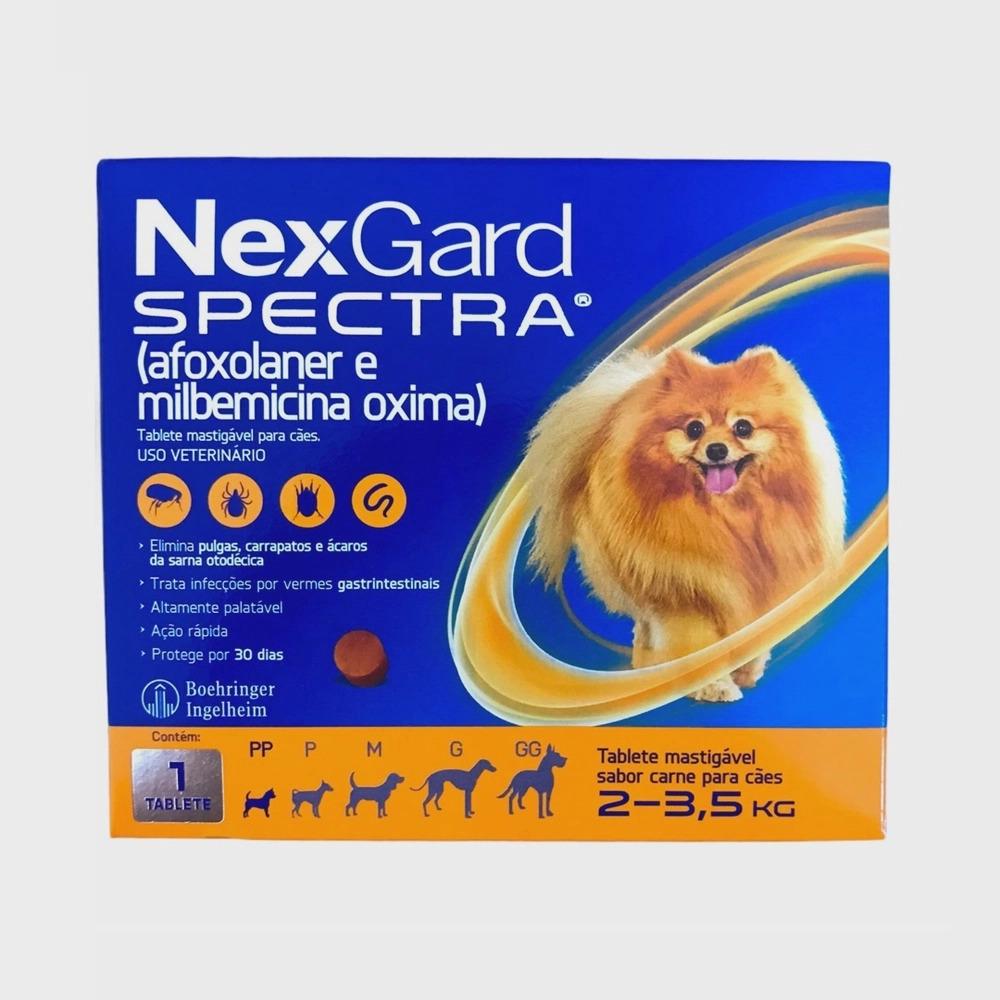 Nexgard Spectra (afoxolaner e milbemicima oxima) é um tablete mastigável para cães que protege contra pulgas, carraptos, ácaros da sarna otodécica e infecções por vermes gastrintestinais. é altamente palatável, tem ação rápida e protege por 30 dias! Deve ser administrado via oral, na dose correta de acordo com o peso do animal, uma vez ao mês. Nexgard Spectra elimina pulgas, carrapatos e ácaros da sarna otodécica em cães adultos e filhotes acima de 8 semanas de idade, com peso corpóreo mínimo de 2kg. é também indicado para tratamento e prevenção de infestação por pulgas (Ctenocephalides felis), carrapatos (Rhipicephalus sanguineus) e tratamento contra ácaros da Sarna Otodécica (Otodectes cynotis). Nexgard Spectra é indicado para o tratamento de infecções dos seguintes nematódeos gastrintestinais adultos: ascarídeos (Toxocara canis), ancilostomatídeos (Ancylostoma sp. ) e tricurídeos (Trichuris vulpis).
