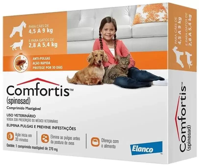 O Antipulgas Elanco Comfortis 270mg para Cães e Gatos é o primeiro comprimido mastigável sabor carne, com aprovação do FDA. Elimina pulgas e atua na prevenção da infestação por um mês, é de uso oral e começa a agir 30 minutos depois de ingerir o tablete mastigável, 4 horas depois, elas somem completamente, e por ser administrado via oral, Comfortis permite que seu cão brinque, ganhe abraços e até tome banho, sem que nada interfira no tratamento, é uma solução inovadora que vai mudar a forma de manter seu cão livre de pulgas. Comfortis é um tablete mastigável que tem modo de ação inédito, com seu princípio ativo (spinosad) tem sua eficiência pela ligação nos sítios nervosos da pulga, levando-o a paralisia e morte em poucos minutos.