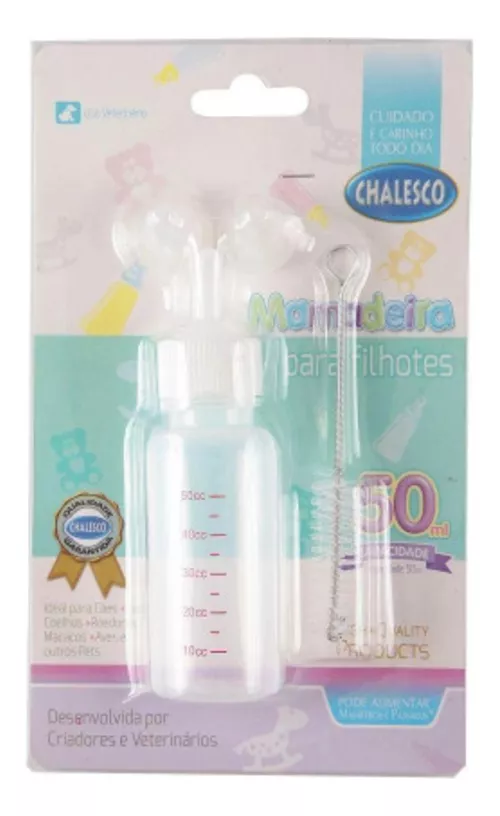 Mamadeira especial para filhotes desenvolvida por especialistas para suprir filhotes com desmame prematuro ou filhotes que perderam as suas mães. Ideal para os primeiros dias de vida de filhotes como: cães, gatos, macacos, roedores, pássaros, papagaios, araras e também uma série de mamíferos que tem condições de se adaptarem à anatomia do bico da mamadeira Chalesco.
